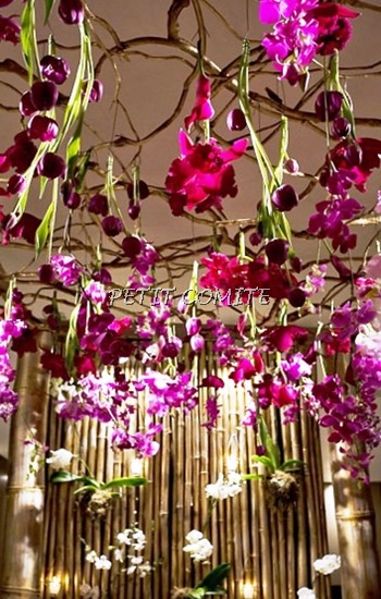 MESA DE DOCES: Cattleyas , Dendrobium phalaenopsis , Denphales e Tulipas ... suspensas delicadamente sobre Mesa com tampo em bambu natural.